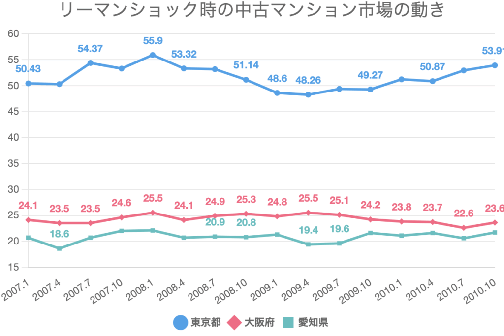 東京で1割下がったのにも理由がありまして、リーマンショックの時に、新興不動産企業と呼ばれた新築マンションのディベロッパーが、銀行からお金が借りられなくなったことにより、資金繰りが悪化し、たくさんの会社が倒産しました。